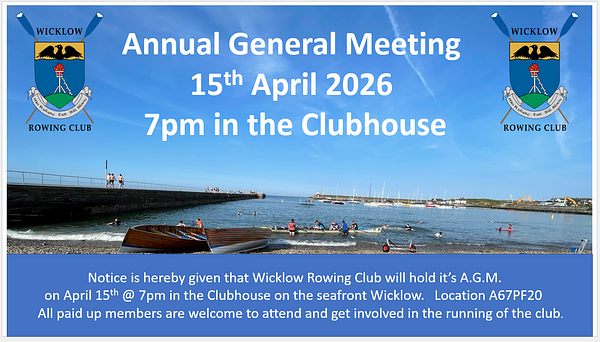 Notice is hereby given that Wicklow Rowing Club will hold its AGM on Wednesday April 15th in the clubhouse Wicklow Harbour at 7pm